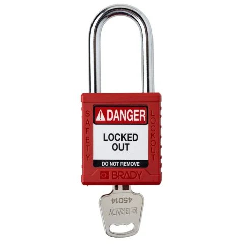 Brady® Nylon Safety Lockout Padlock, Keyed Different, Steel Shackle, Red - 153452