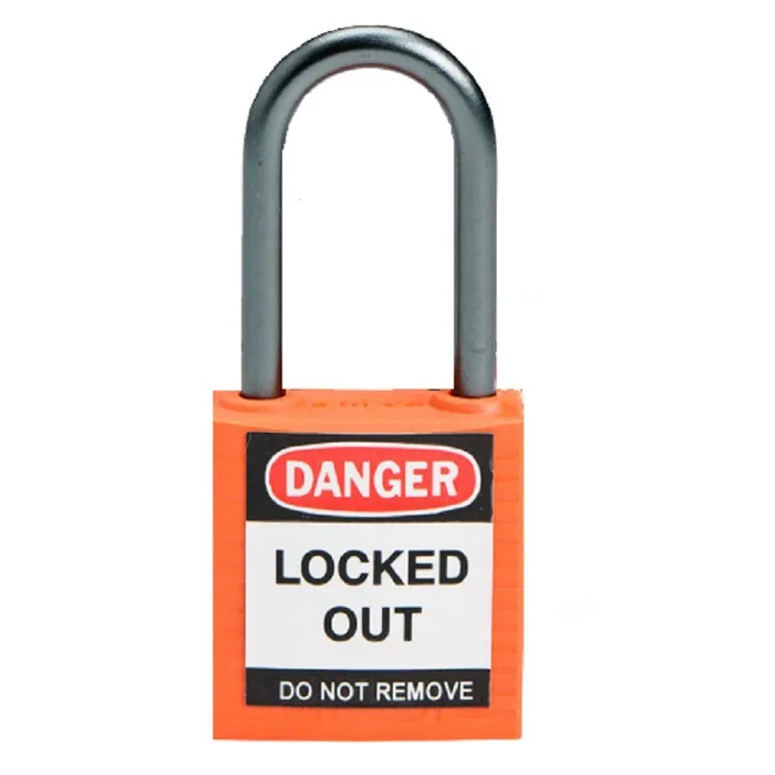 Compact orange safety padlock, 38 mm. Shock-insulated, tamper-resistant, and key-retaining. Includes 1 key.