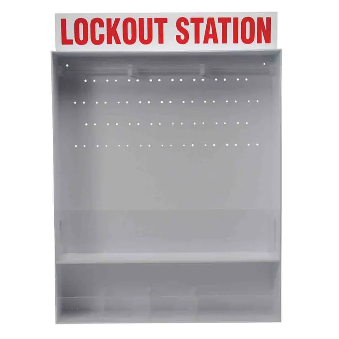Wall-mountable lockout station made of sturdy white polystyrene. Features a built-in lock rail for 20–25 padlocks and 34 pegboard-style hooks for organizing lockout tools. Centralizes lockout equipment for quick access. Lockout devices sold separately.