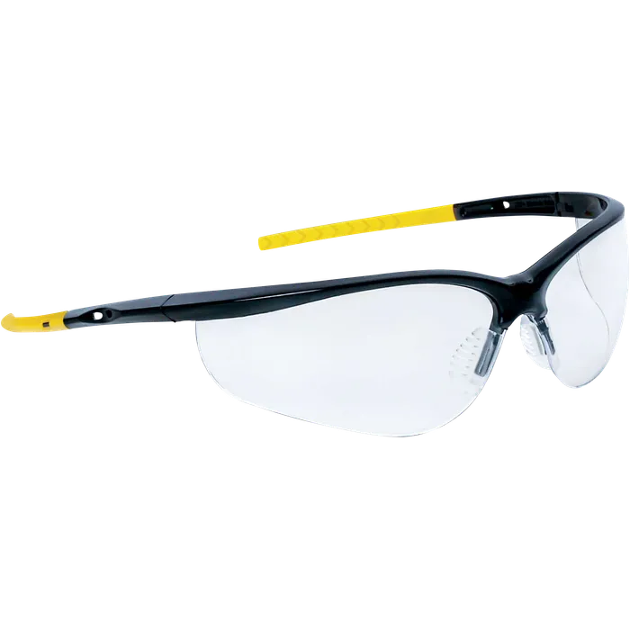 The Delta Plus IRAYA CLEAR Safety Glasses combine sporty aesthetics with dependable eye protection, making them ideal for indoor tasks that demand both style and safety. Built with dual clear polycarbonate lenses featuring a 9.5 base curve, they deliver wide coverage and excellent clarity. Enhanced with UV400 protection, anti-fog, and anti-scratch coatings, these glasses ensure long-lasting performance. The sleek black-and-yellow sports frame, non-slip temples, and soft TPR nose pads provide a secure and comfortable fit. At just 24 g, they are ultra-lightweight and perfect for extended wear in demanding environments.