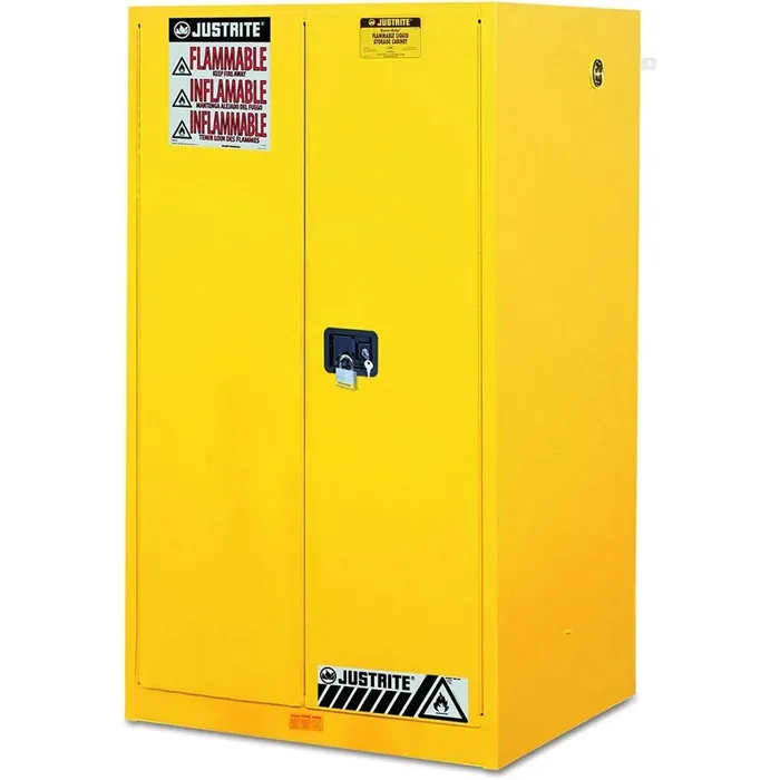 The Justrite Sure-Grip® EX Flammable Safety Cabinet (60-gallon, Model 8960001) provides secure, code-compliant storage for flammable fuels and chemicals. Built from 18-gauge double-wall welded steel with 1-1/2” insulating air space, it offers superior fire resistance. High-performance, self-latching doors with a three-point stainless steel bullet latching system ensure fail-safe closure under fire conditions.