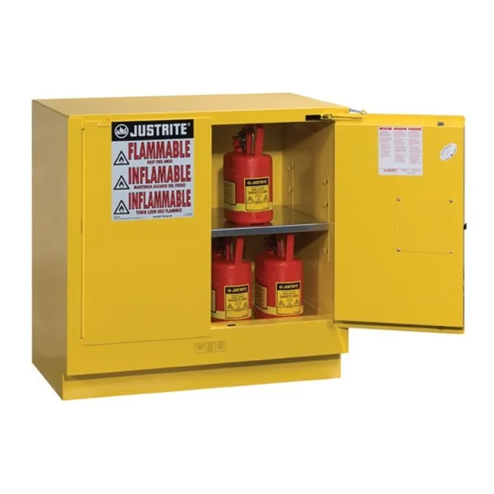 The Justrite Sure-Grip® EX Undercounter Flammable Safety Cabinet (22-gallon, Model 892320) provides secure, code-compliant storage for flammable fuels and chemicals. Built from 18-gauge double-wall welded steel with 1-1/2” insulating air space, it delivers superior fire resistance. High-performance, self-latching doors with a three-point stainless steel bullet latching system ensure fail-safe closure under fire conditions. For added security, the U-Loc™ handle includes a cylinder lock and key set or accepts a padlock, while Haz-Alert™ reflective labels remain visible in low light or emergencies.