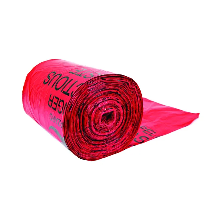 Pack of 100 red biohazard liner bags, 11 microns thick, for safe temporary waste collection.