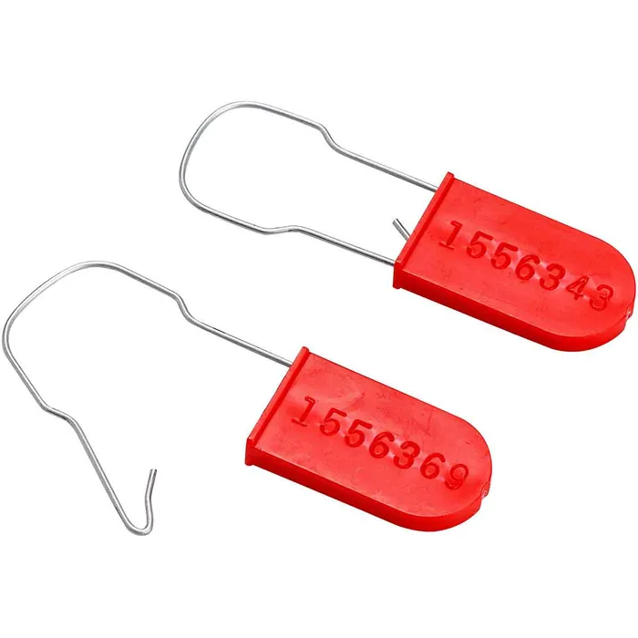 Tamper-evident padlock seals made of durable polypropylene with stainless steel wire hasps. Factory-stamped with sequential numbers for secure identification.