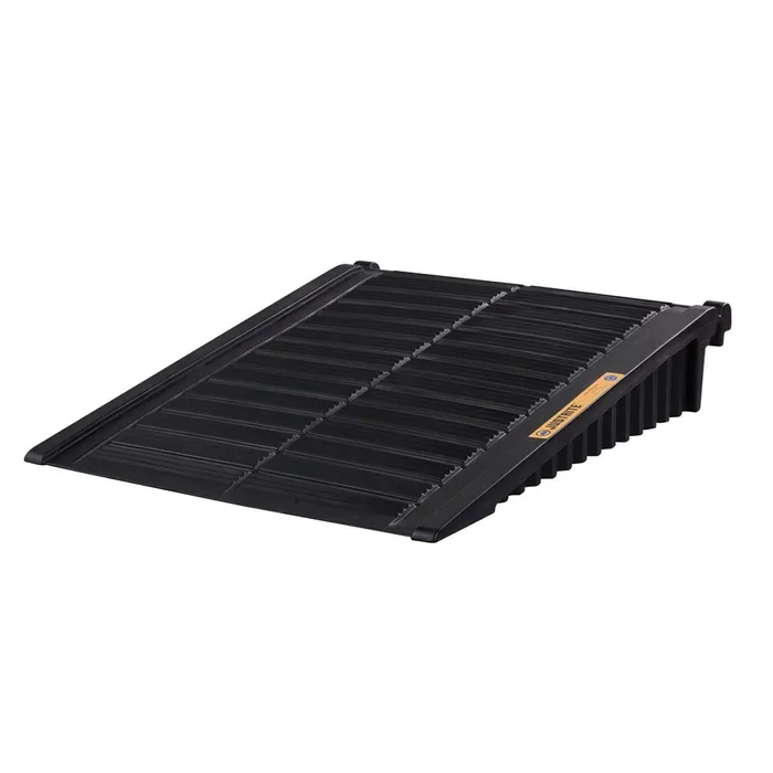 The EcoPolyBlend™ Ramp is designed for safe and efficient loading and unloading of 2 to 4-drum DrumShed™ units. Constructed from durable recycled polyethylene, the black version contains 100% recycled material, while the yellow version is made from non-recycled polyethylene. With a load-bearing capacity of 1000 lbs (455 kg) and a service temperature range of -30°F to 120°F (-39°C to 49°C), this ramp ensures reliable performance in demanding environments. Its rugged design enhances workplace safety and simplifies drum handling operations.